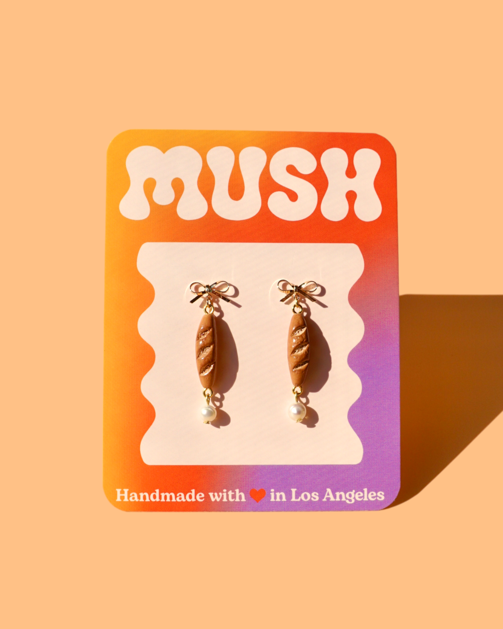 Our Mini Baguette Dangle earrings are handmade with polymer clay for a lightweight feel and assembled with 18k stainless steel gold plated hypoallergenic hardware. All of our polymer clay earrings and accessories are designed and handmade in Los Angeles, California by maker and founder, Kyrstin Constantino.