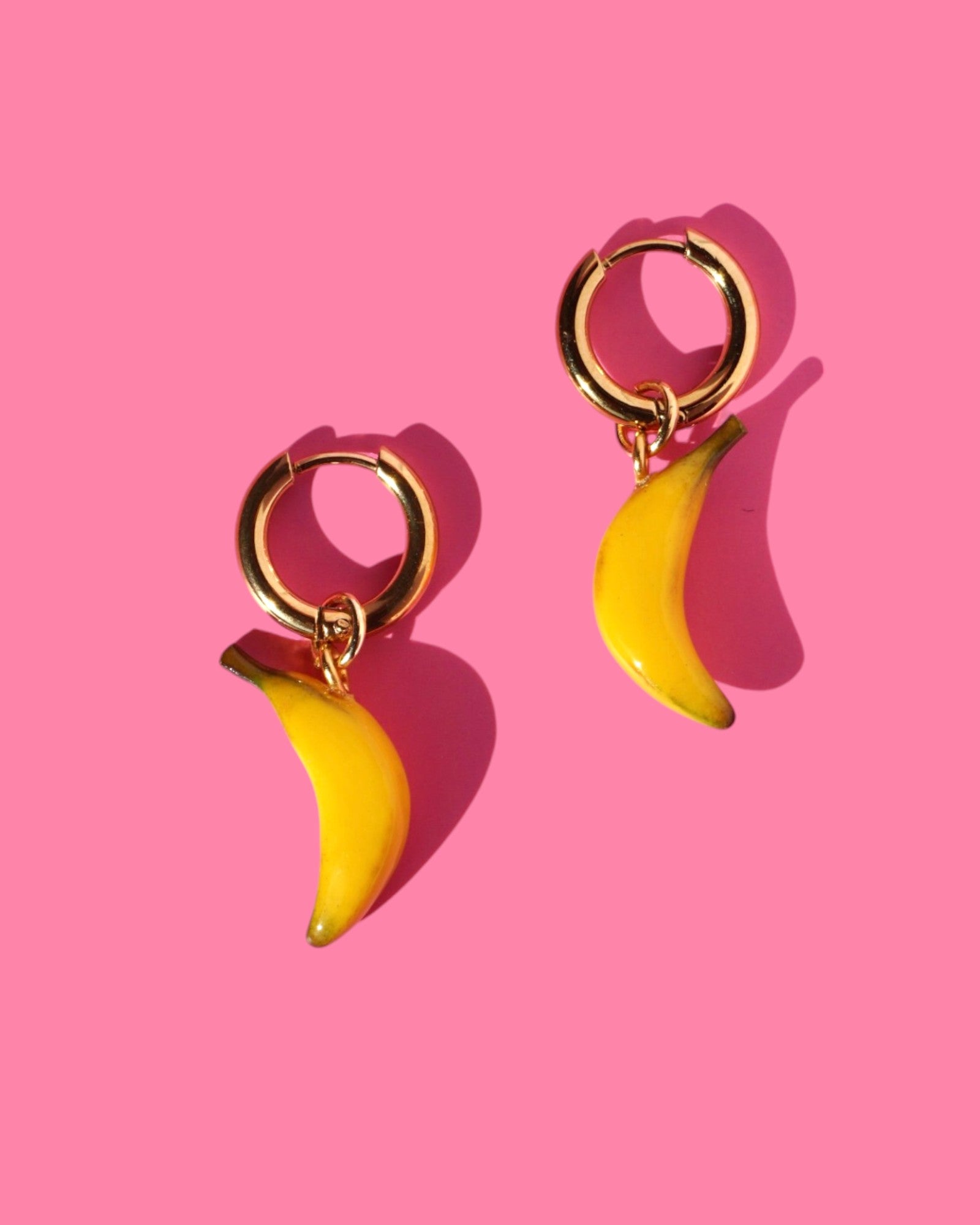 Our banana charm earrings are sculpted with polymer clay for a lightweight feel and assembled with 316L surgical steel hypoallergenic hardware. All of our polymer clay earrings and accessories are designed and handmade in Los Angeles, California by maker and founder, Kyrstin Constantino.
