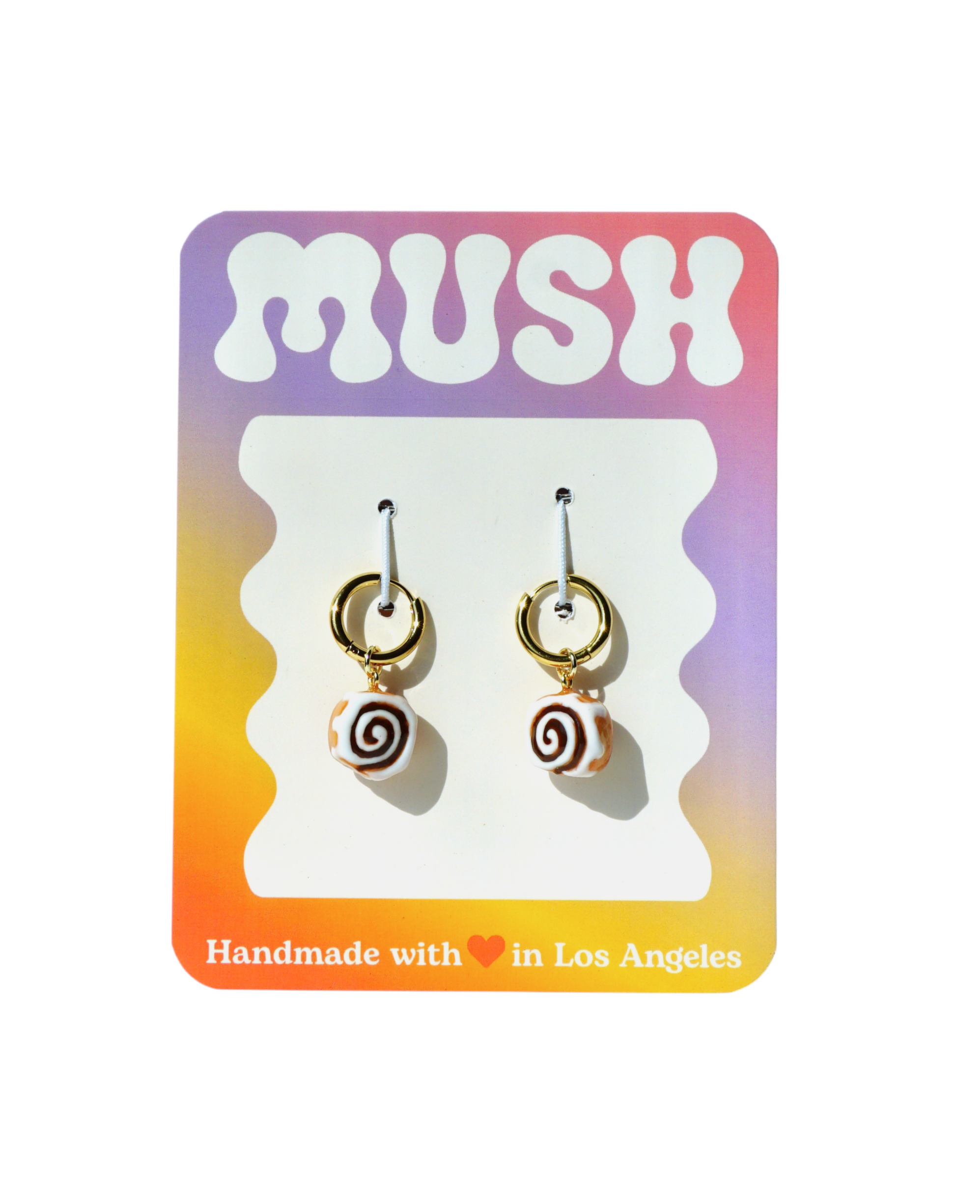 Our cinnamon roll charm earrings are sculpted with polymer clay for a lightweight feel and assembled with 316L surgical steel hypoallergenic hardware. All of our polymer clay earrings and accessories are designed and handmade in Los Angeles, California by maker and founder, Kyrstin Constantino.