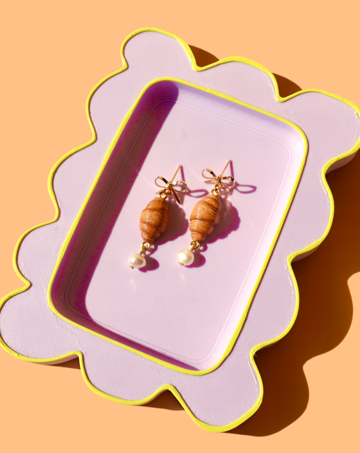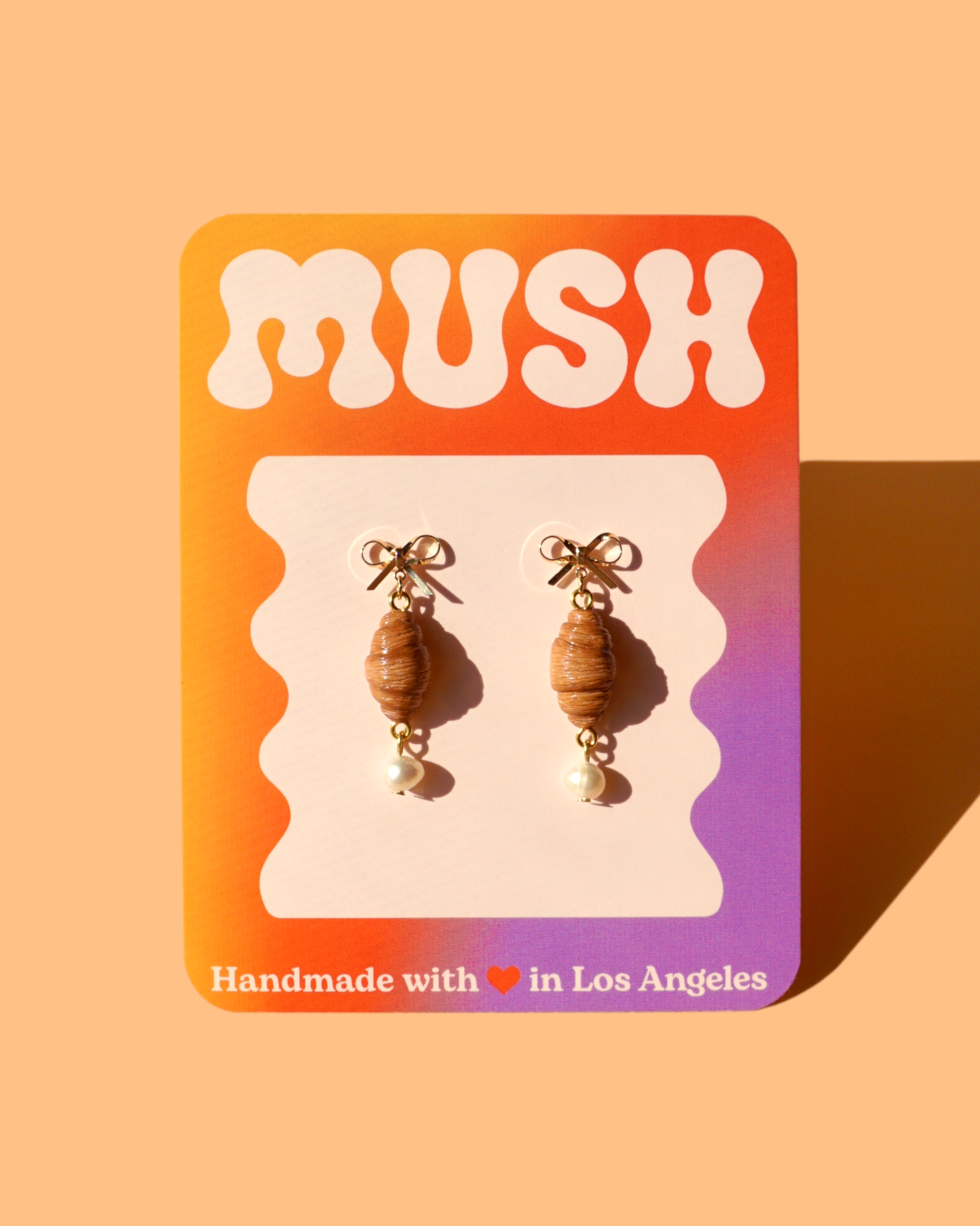 Our Croissant Dangle earrings are handmade with polymer clay for a lightweight feel and assembled with 18k stainless steel gold plated hypoallergenic hardware. All of our polymer clay earrings and accessories are designed and handmade in Los Angeles, California by maker and founder, Kyrstin Constantino.