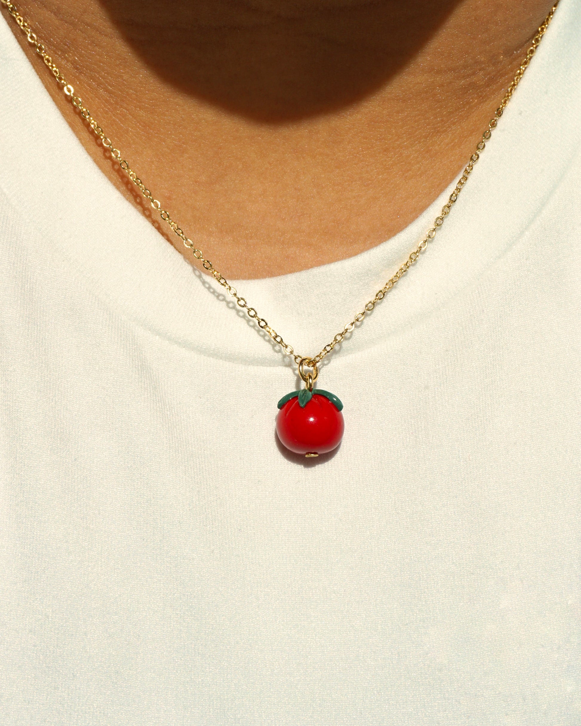 Our Tomato charm necklace is handmade with polymer clay for a lightweight feel and assembled with a 24k gold filled hypoallergenic chain. All of our polymer clay accessories are designed and handmade in Los Angeles, California by maker and founder, Kyrstin Constantino.
